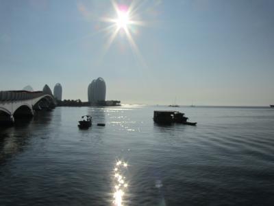 Hinflug nach Haikou im Norden der Insel ab Tianjin, Ankunft abends 21 Uhr, von dort sind wir mit anderen tausend Chinesen in einem Stadtbus zu den Hotels gefahren. Erstmal hab ich mich schon verjagt, wie groß Haikou eigentlich ist, hätte das viel kleiner erwartet. Aber es wehte ein laues Lüftchen, war schön warm, alles gut. Sind dann zum Hotel, was auch wirklich schön war. Gut, die Fensterscheiben waren ziemlich angegammelt, aber es war sauber und ganz nett eingerichtet. Aber wie immer, es konnte keiner Englisch, gut, daß unser deutscher Kollege mit war.