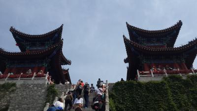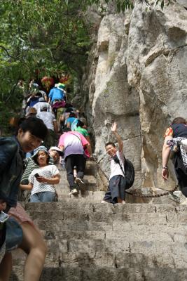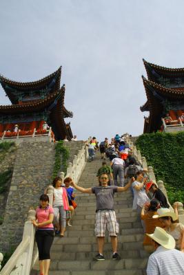 Und so sind wir nun stellenweise auf allen Vieren den Berg hinaufgekrochen. Es war das Anstrengendste, was ich jemals erlebt habe! Wenigstens erging es allen so, selbst die fittesten Chinesen hatten Last, da hochzukommen. Dafür war die Aussicht traumhaft, die Luft viel besser in der Höhe und alle waren happy, es geschafft zu haben, nach oben zu kommen! Dort kam man einer Tempelanlage an und konnte Buddhafiguren besichtigen.