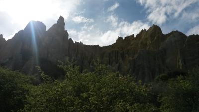 Aus dem Regen sind wir in die Sonne und wieder tiefer in die Berge gefahren an Queenstown vorbei nach Twizel. Die Gegend wurde immer einsamer und verlassener. Und wir haben uns gefragt, wie man denn da leben kann. Wunderschön, aber so verlassen, das muß man wirklich lieben. Einkaufsmöglichkeiten sind so gut wie gar nicht vorhanden, keine ärztliche Versorgung, nichts. Auch, wenn wir die Stille und Einsamkeit viel mehr zu schätzen wissen, seitdem wir in China leben, wäre das doch wirklich nichts auf Dauer. Vor Twizel haben wir uns noch Ahuriri Clay Cliffs angesehen, interessante Klippen, die aus Geröll und Schlamm bestehen.