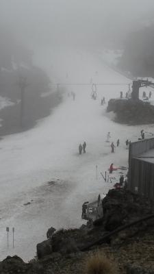 Je weiter wir dann südlich Richtung Ohakune fuhren, desto mieser wurde leider das Wetter. Windig war es eh schon die ganze Zeit, nun kam auch noch Regen hinzu. Von weitem sah man schon die schneebedeckten Berge, wo wir eigentlich einen Rundflug machen wollten, was aber aufgrund des Wetters nicht möglich war. Also sind wir so in die Berge gefahren und haben uns das Skigebiet mal angesehen, wo halb China unterwegs war. Unsere Unterkunft war eine typische Skihütte, da aber gerade für das Skifahren die Nebensaison angebrochen war, war nichts los und der Ort so winzig, daß es auch nichts zu unternehmen gab. Abends sind wir auf dem Berg hochgefahren. Es ist kaum zu begreifen morgens im strahlenden Sonnenschein aufzubrechen um jetzt in einem Skigebiet zu stehen und die Kiwis beim Skifahren zu zuschauen.
